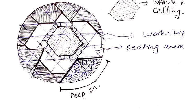 Along with the generation of ample ideas, we also had to work towards building an interesting floor plan. I started brainstorming right away and asked for the floor plan of the building to develop on. Nikunj provided me with the plan and I started sketching right away. The perimeters to be kept in mind was that it should involve human participation in some form. Making plans and parallelly generating information helped us to sketch with an idea of what to place where provided that the plan is taken forward. The plans were drawn and many options were discussed. The plans were though through and differentiated how each one was different from one another. While sketching out the plan, I had to visualize the space in 3 Dimension that is, how would it actually feel like to walk through it. Compartmenting was another task, each topic that was temporarily chosen had to be kept in one compartment or section in a smooth flow. The symmetric plan was taken forward at first but later that same idea was randomized and converted into a new product. Developing and redeveloping ideas was the process we took in hand. Combining good parts of different ideas to churn out a best one.